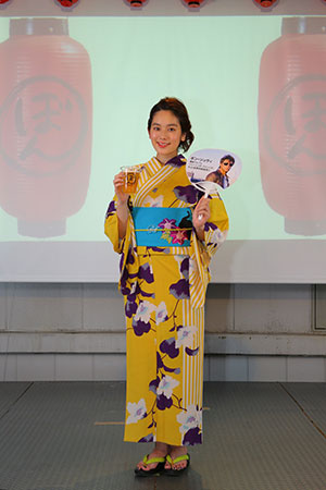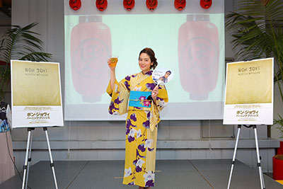 会場内では、ボン・ジョヴィの新曲を聴かせながらキンキンに冷やした“ボンジョビール”がふるまわれ、“ボンジョ美女”として筧美和子さんが登場!