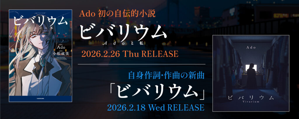 WHAT'S NEW 2026.02.14 TOPICS 自ら作詞・作曲を手掛ける新曲「ビバリウム」自身初となる”実写ジャケット写真”が公開! 2026.02.12 TOPICS LIVE Blu-ray & DVD『Hibana』購入特典デザイン公開! 2026.02.09 TOPICS フジテレビ系 月9ドラマ『ヤンドク!』主題歌「エンゼルシーク」完璧さを失い地上に降りた主人公が不完全なまま輝きを取り戻す希望を描いたMVが公開! 2026.02.09 TOPICS LINEミニアプリ「ユニバーサル ミュージック・タップ」に Ado「MAGIC」のゲームが登場! 2026.01.27 TOPICS 「エンゼルシーク」オリジナルアイコンメーカーが登場! MORE