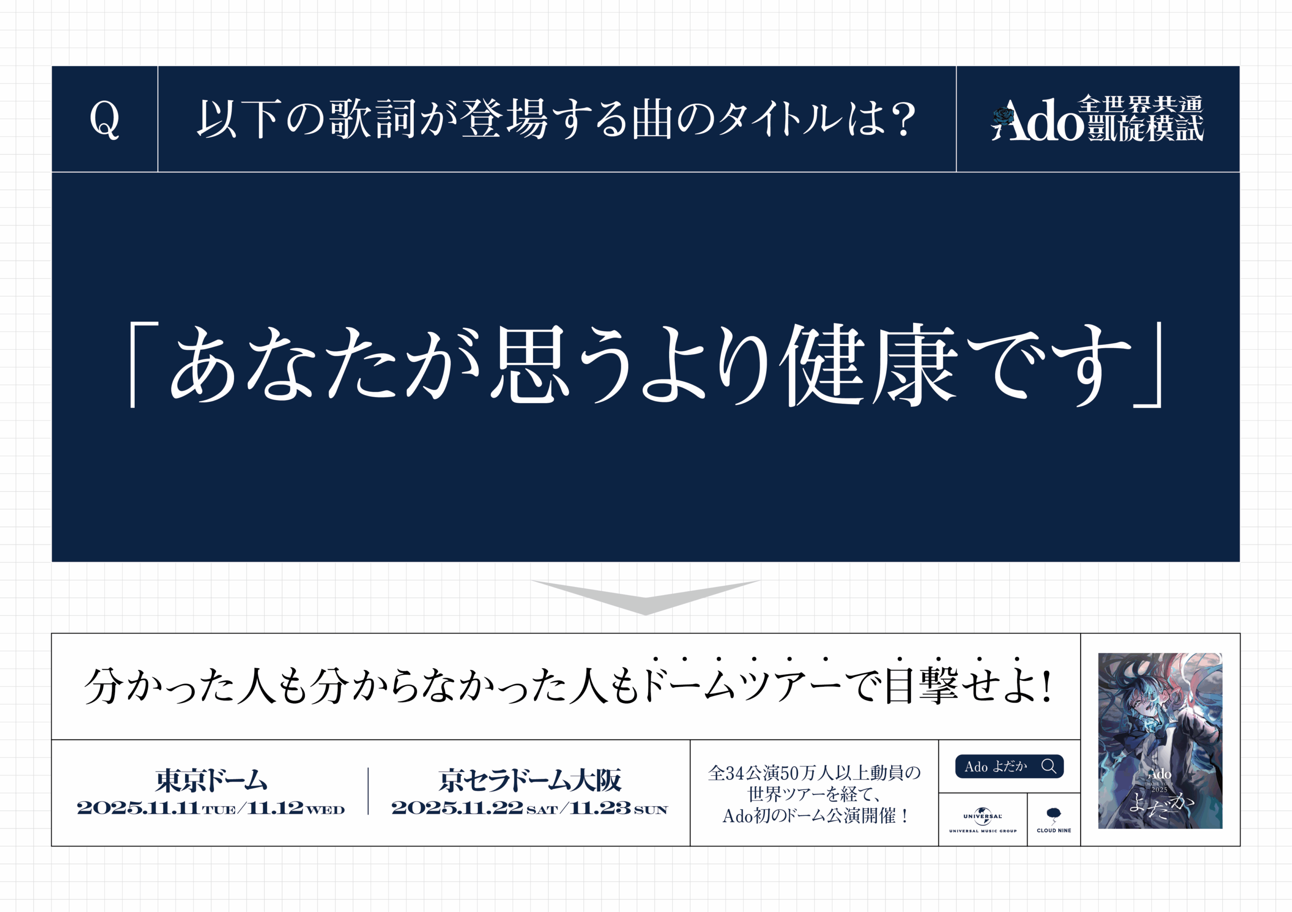いよいよ凱旋公演となるドームツアー“Ado DOME TOUR 2025「よだか」”開催まで残り1ヶ月となり、新たな施策がスタート!本日より、「Ado全世界共通凱旋模試」の開催が決定しました。特設サイトにて実施されるので、全世界どこからでも参加可能です。あなたのAdo力をぜひ、お試しあれ。さらに、東急電鉄、車内ドア横ポスターにも登場します。凱旋公演となるドームツアー“Ado DOME TOUR 2025「よだか」”のチケットは現在発売中なので、是非見逃さずチェックしてください!