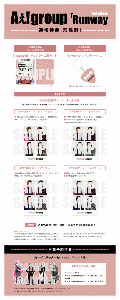 2026年2月25日(水)発売 Aぇ! group 2nd Album『Runway』の通常特典(形態別)の絵柄が公開となりました。先着特典の為、なくなり次第配布終了となります。ぜひお早めにご予約ください。
