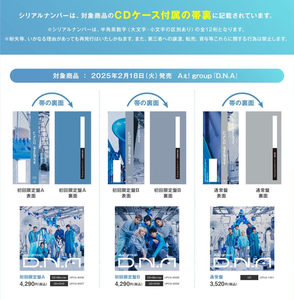 さらに、同じシリアルナンバーを用いて形態別となる特典動画もご視聴いただけます!詳細はAぇ! group『D.N.A』購入者対象 シリアルナンバー特典特設ページからご確認ください。