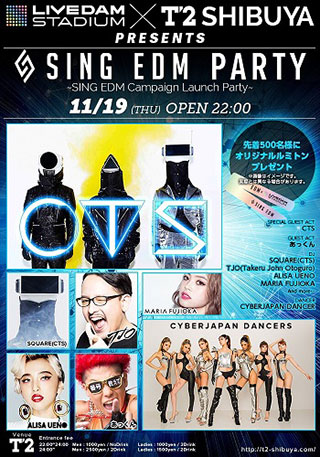 さらに、“SING EDM”のスタートを記念して、11月19日にはT2 SHIBUYAにて“SING EDM PARTY”の開催が決定。SPECIAL GUEST ACTにCTS、GUEST ACTにあっくん、DJにSQUARE(CTS)、TJO(Takeru John Otoguro)、Alisa Ueno、Maria Fujiokaなど、DANCERにCYBERJAPAN DANCERSを迎え、フェスさながらの豪華ラインナップが出演する予定だ。