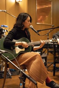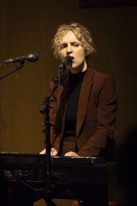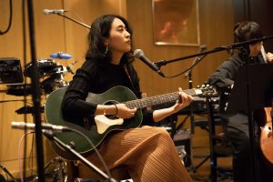 最初に登場したのは、角銅真実。1曲目の「Lark」でチェロのピチカートに合わせて、ゆったりと歌い出すと、優しいウィスパーボイスが会場内を温かく包みこんだ。披露したのは1曲を除き新作『oar』収録曲であったが、この日のベース~チェロ~ギター&アコーディオンという編成に合わせた特別アレンジで、アンサンブルの芳醇な響きとともに、その歌声の魅力をアピールした。