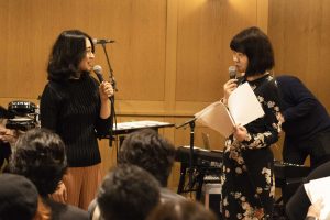 演奏後のトークでは、今回“うた”にフォーカスしたアルバムを制作した経緯について、「打楽器奏者としての活動のなかで“うた”に関わることが増えて、その面白さに気づいた。“うた”は作る自由だけでなく、受け取る自由があるのが面白い」と説明した。また、新作制作中にアグネス・オベルの音楽を聴いていたという角銅は、「聴いていると、いろいろな情景が浮かぶ。クラシックをはじめ様々なバックグラウンドが自由に行き来している音楽性にも刺激を受ける」とアグネスの魅力を語った。