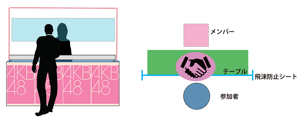 飛沫防止用の透明なシートのみ設置のうえ、メンバーは手袋を着用せず握手会を行います。お客様自身の不織布マスクの着用および手袋の着用につきましては、お客様のご判断にお任せいたします。
