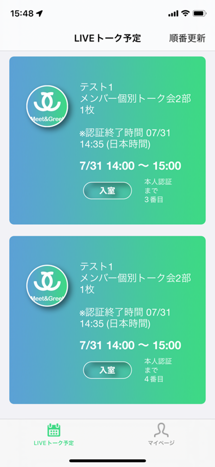 (3) アプリの「LIVEトーク予定」に当選された「全ての予約枠」が表示されていることを確認ください。※本人認証の順番は自動で割り振られます。