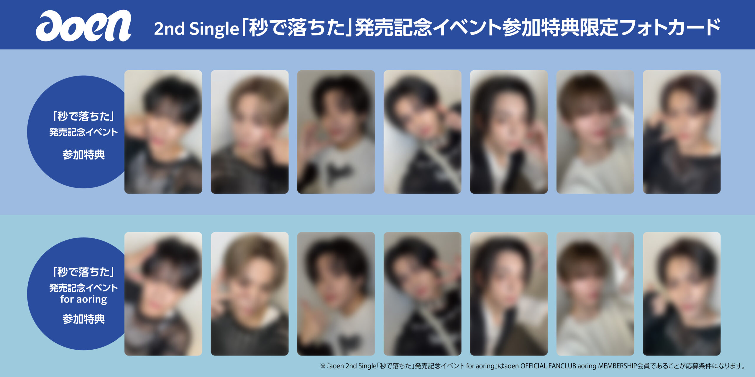 ※限定フォトカードは、『aoen 2nd Single「秒で落ちた」発売記念イベント』と『aoen 2nd Single「秒で落ちた」発売記念イベント for aoring』で絵柄が異なります。