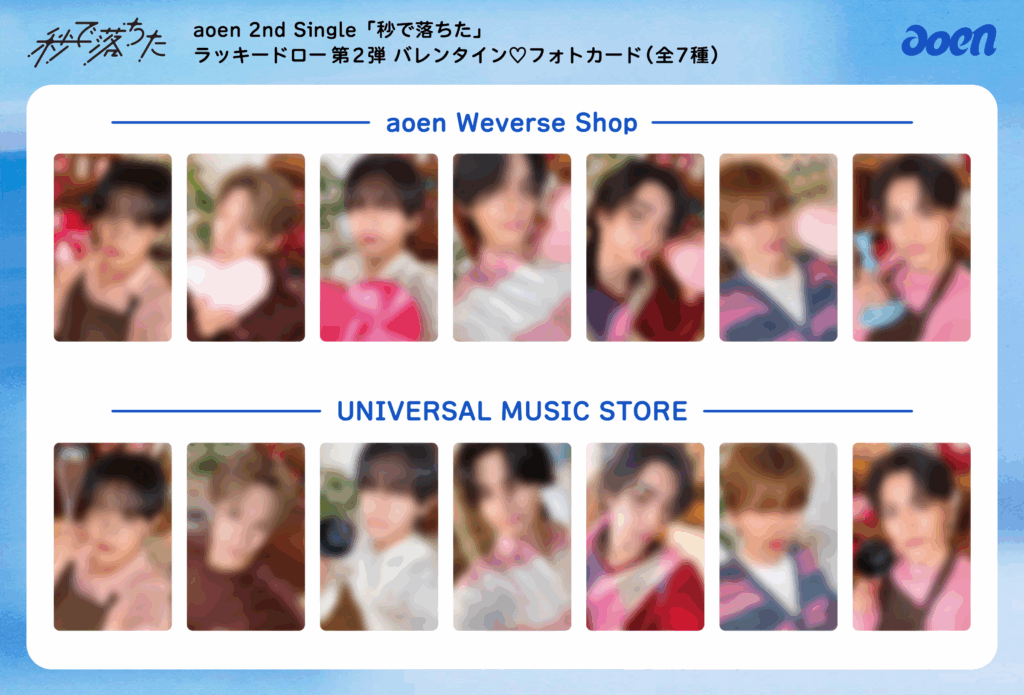 aoen Weverse ShopまたはUNIVERSAL MUSIC STOREにて、下記期間内にラッキードローイベント対象商品をご予約・ご購入のお客様に先着で、CD1枚につきラッキードローイベント限定絵柄「メンバー別フォトカード」を全7種のうちランダムで1枚プレゼントいたします。