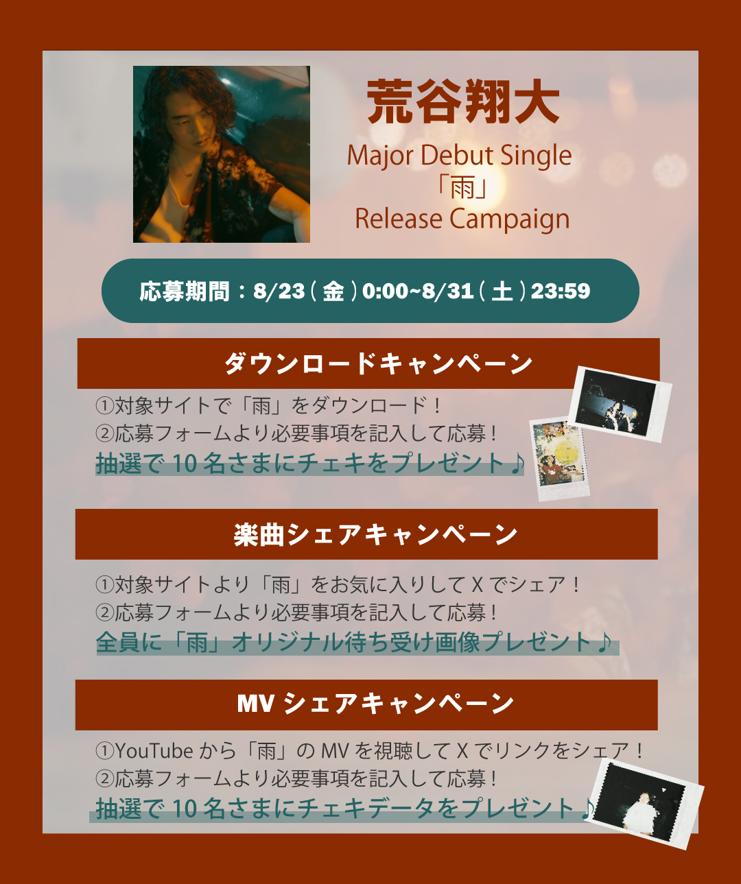 概要:対象サイトで「雨」をダウンロードして応募フォームより応募で抽選で10名さまにチェキをプレゼント。