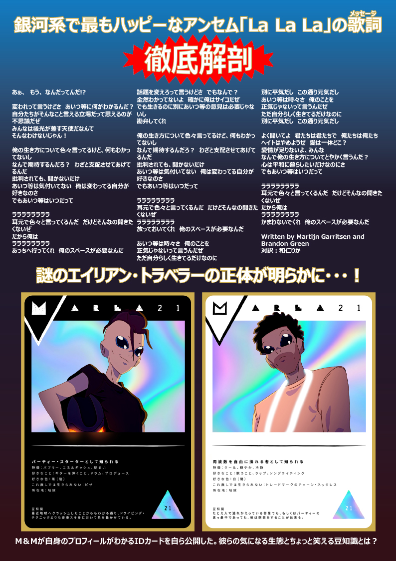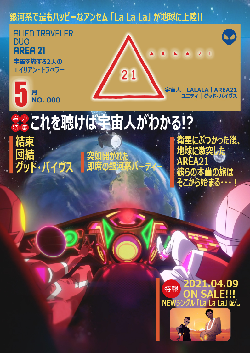AREA21の謎に迫る『月刊△』刊行! 2021.05.14 TOPICS 先日地球に降り立ったばかりの、謎のエイリアン・トラベラー二人組AREA21。 「La La La」のメッセージ配信後、彼ら自らのIDカードをSNSで公開するなど、少しずつ彼らの素性が明かされているものの、まだまだ謎ばかり。 彼らの謎を解き明かすため、この度『月刊△』(読み方:ゲッカンサンカク)を刊行! 今後彼らから発信されるメッセージを徹底解剖し、彼らの謎に迫る・・・!