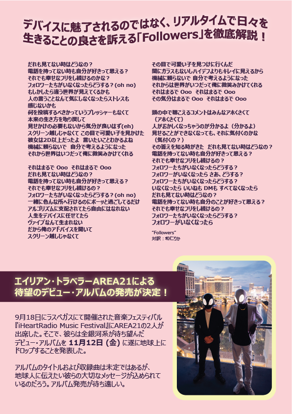 新曲「Own The Night」10/15(金)配信決定!『月刊△』10月号も公開! 2021.10.13 TOPICS AREA21の公式SNSで新曲「Own The Night」が今週の金曜日10/15にリリースされることが発表された。シャンパンを開けるM&Mの姿が映ったジャケット写真も公開となった。 View this post on Instagram AREA21(@area21)がシェアした投稿 さらに前曲「Followers」の解説やアルバム情報をまとめた『月刊△』10月号も公開。これを読んで、新曲「Own The Night」を楽しみに待っていてほしい。
