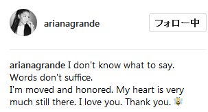 アリアナはこの知らせに関して、「なんて言ったらいいか、分からない。言葉では十分に表現できない。感動しているし、光栄だわ。