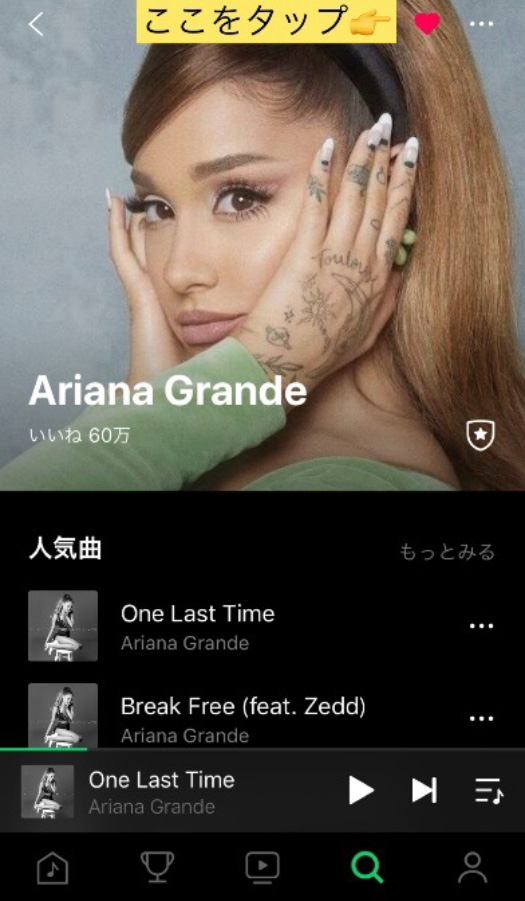 ①LINE MUSICでアリアナ・グランデをフォロー(プッシュ通知はオンにしてください)