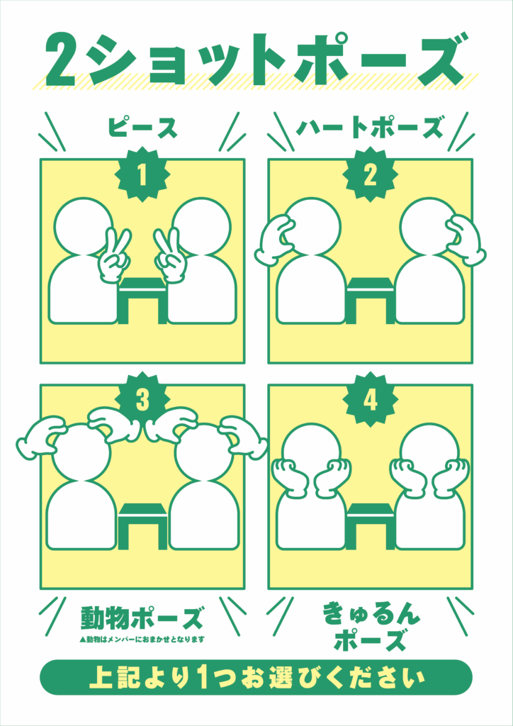 ・ポーズは以下の4ポーズより1つお選びいただき、直前スタッフにお伝えください。