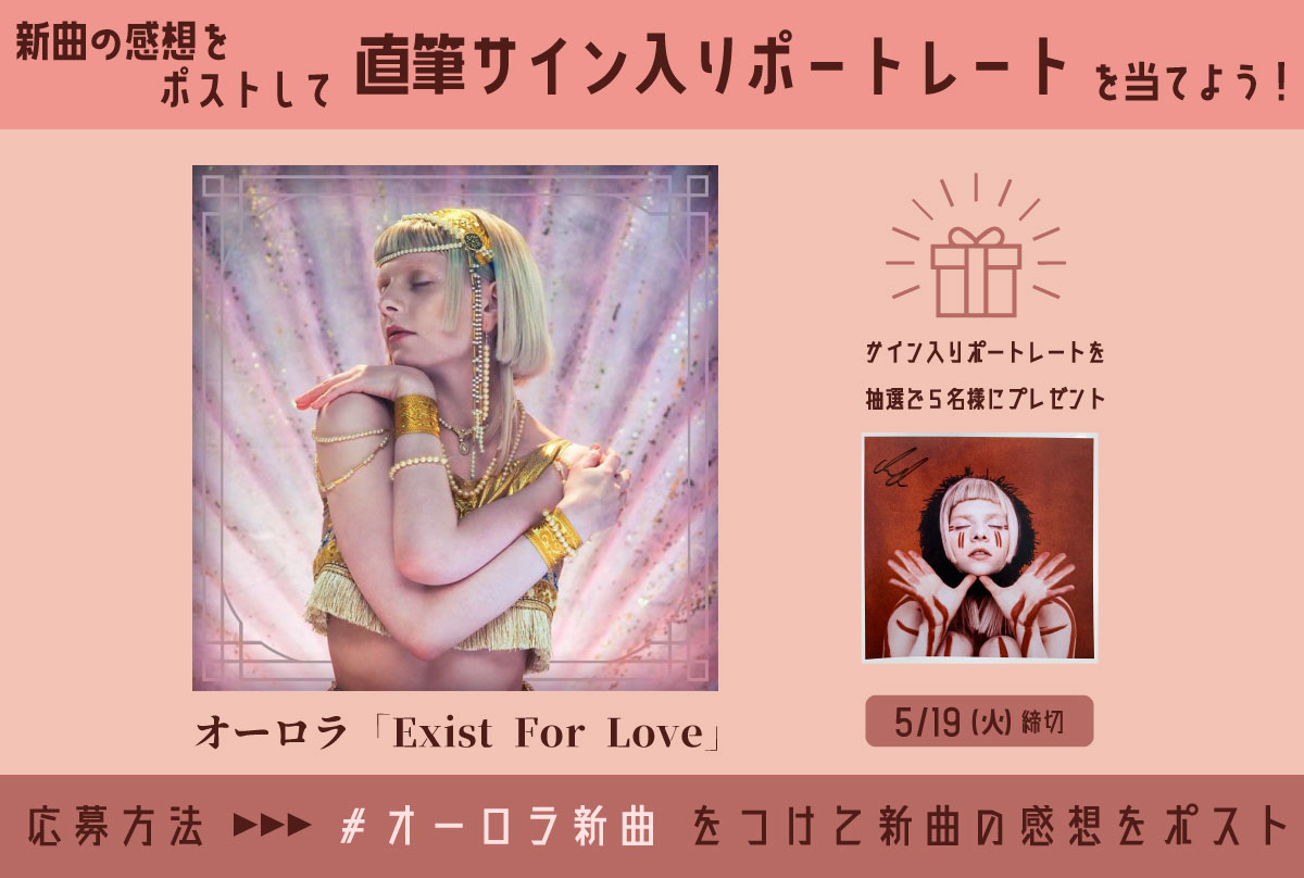 NEWS ALL TOPICS MEDIA LIVE/EVENT 2020.06.16 MEDIA - TV 6/18(木)深夜 CX「Tune」で紹介されます! 2020.05.15 TOPICS 新曲リリース記念!感想投稿キャンペーンスタート! 2020.05.15 TOPICS 北欧の新世代歌姫オーロラ、約1年振りの新曲「Exist For Love」をミュージック・ビデオと同時公開!自身初となるラヴ・ソングに挑戦 2020.04.06 MEDIA - TV 4月6日(月)24時~~ドキュメンタリー放送 2020.04.02 LIVE SUPERSONIC 2020 出演決定! 2020.03.30 TOPICS 北欧の歌姫オーロラ、オンライン・フェス「Verftet Online Music Festival」に出演!ライヴ動画も公開 2020.03.09 TOPICS オーロラが歌う「Into the Unknown」が公開 2020.02.04 MEDIA - TV 2/10(月)tvk「洋楽天国+」にてオーロラのインタビューがオンエア! 2020.01.31 TOPICS 『アナと雪の女王2』“不思議な声”役のオーロラが選ぶディズニー・ソングが公開! 2020.01.24 TOPICS 北欧の新世代歌姫オーロラ、第92回アカデミー賞にてイディナ・メンゼルとのスペシャル・パフォーマンスが決定! 1…8910111213141…1011121314
