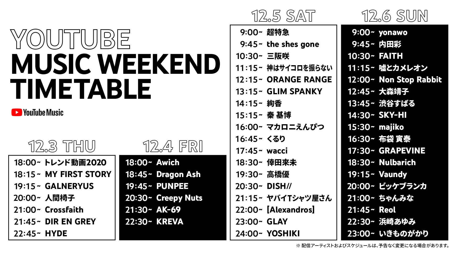 「YouTube Music Weekend」にAwich が参加&タイムテーブルを公開 2020.11.17 MEDIA - WEB 12/3 〜 12/6 開催 「YouTube Music Weekend」 のタイムテーブルが公開されました。 Awichのライブ配信は、 12/4(金)18:00スタートとなります。 リマインダー設定は以下より設定いただけます。 https://www.youtube.com/watch?v=F4nZlXvTC54 <タイムテーブル>