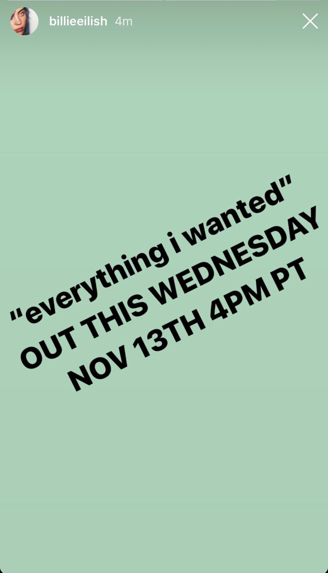 本日、ビリーのインスタグラムのストーリーズで新曲「everything i wanted」の世界同時配信リリースを発表ました。アルバム発売以降、約8カ月ぶりとなる新作は、日本時間11月14日の午前9時に主要配信サイトで公開される予定です。