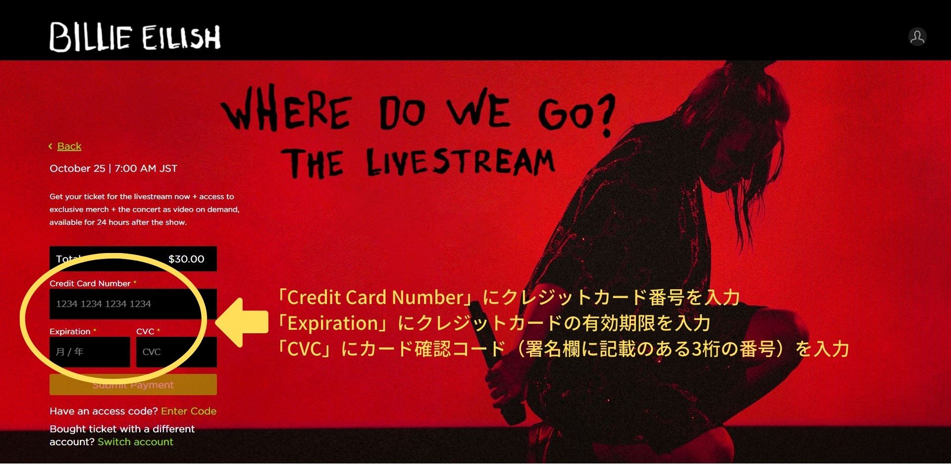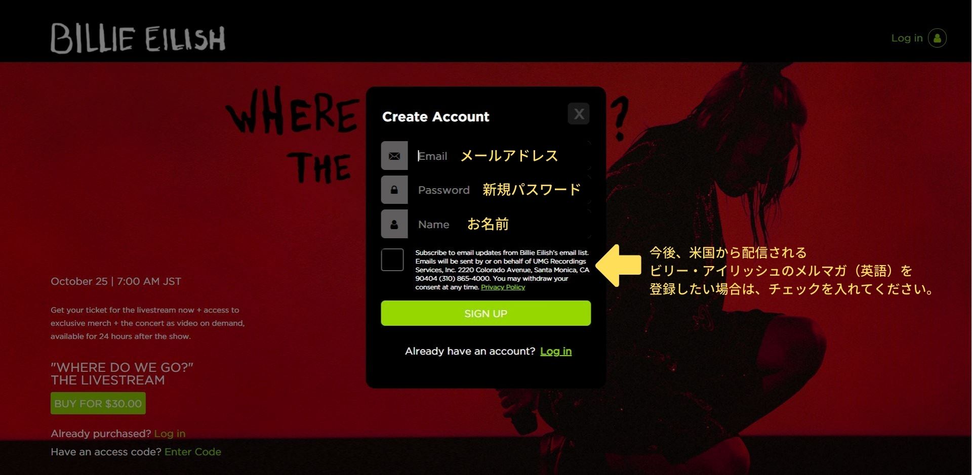 A:こちらのページを開けているのであれば、あなたのチケットは確約されています。現地時間10月24日15時(PT)(日本時間、10月25日午前7時)になりましたら、 livestream.billieeilish.com へ戻り、アカウント作成時に使用したメールアドレスとパスワードを入力してログインしてください。※ライブの1時間前となる日本時間10月25日午前6時から、PRE SHOWが始まります。