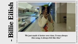 「私達は、色んな方法で曲作りをしている。ピアノやギター、ウクレレから始まることもあれば、曲のメロディーや歌詞から始まることもあって、ビートとかそういうものから始まる場合もあるの。時間をかけて良いものを作っていくだけ。この曲はこういう気持ちになったから。」ーービリー・アイリッシュ