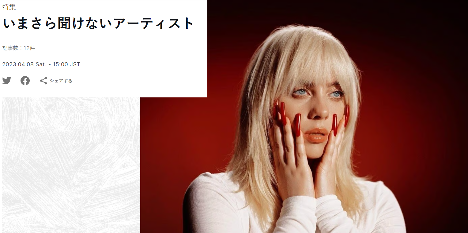 NEWS ALL TOPICS MEDIA LIVE/EVENT 2023.07.13 TOPICS ニュー・シングル「What Was I Made For?」をリリース ミュージック・ビデオも公開 2023.04.10 MEDIA - WEB Fashionsnapにて、ビリー・アイリッシュの紹介記事が公開! 2023.01.26 MEDIA - WEB VOGUE JAPANにて、ビリー・アイリッシュの気候問題に対するインタビューが公開 2023.01.25 TOPICS 1/27(金)限定公開『ハピアー・ザン・エヴァー・ライブ~02アリーナ エクステンデット・カット~』本編から新たなシーンを解禁! 2023.01.13 TOPICS 『ハピアー・ザン・エヴァー・ライヴ〜O2アリーナ エクステンデット・カット〜』世界同日 1/27 fri 限定 劇場公開決定のお知らせ 2023.01.11 TOPICS 『ハピアー・ザン・エヴァー・ライヴ〜O2アリーナ エクステンデット・カット〜』世界同日 1/27 fri 限定 劇場公開決定のお知らせ 2022.11.16 TOPICS 第65回グラミー賞(2023) ノミネート! 2022.10.25 TOPICS ビリー・アイリッシュ EP『Guitar Sopngs』より「TV」「The 30th」のm日本語和訳映像が公開 2022.09.30 TOPICS ビリー・アイリッシュ「Happier Than Ever The World Tour」O2アリーナ公演がApple Musicで配信決定 2022.09.30 MEDIA - TV 10/9(日)放送 日本テレビ「行列のできる相談所」にビリー・アイリッシュが出演! 1…5678910111213…381…7891011…38