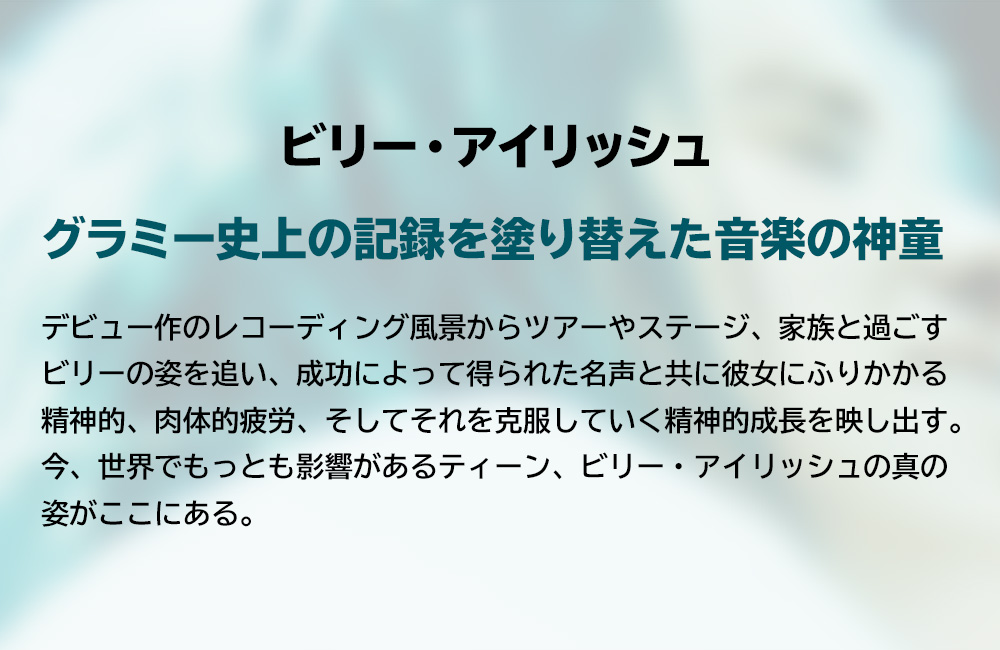 WHAT'S NEW 2021.06.29 TOPICS インフルエンサーのレビュー続々到着! 2021.06.28 TOPICS ユーザーが選ぶ<初日満足度第1位>獲得‼ 2021.06.25 TOPICS Tシャツが当たる!映画「ビリーアイリッシュ:世界は少しぼやけている」感想投稿キャンペーンスタート! 2021.06.16 TOPICS 新宿ピカデリーでも壁面大型ポスター展示中 2021.06.07 TOPICS 東京、大阪の劇場で大型映画ポスター MORE