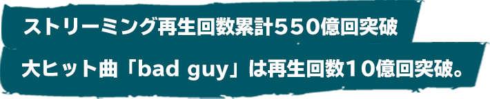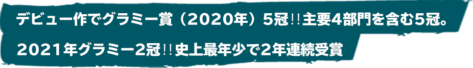 2020年の第62回グラミー賞では史上最年少で主要4部門を含む計5部門を受賞。2021年のグラミー賞でも2部門受賞を果たし、史上最年少19歳で2年連続受賞のアーティストとなった。2020年にリリースした「007/ノー・タイム・トゥ・ダイ(2021年公開予定)」の主題歌「No Time To Die」では、ビリー初のUKシングル1位、初の女性シンガーが担当した007主題歌1位、そして2020年UK発売初週で最も売れた曲となった。
