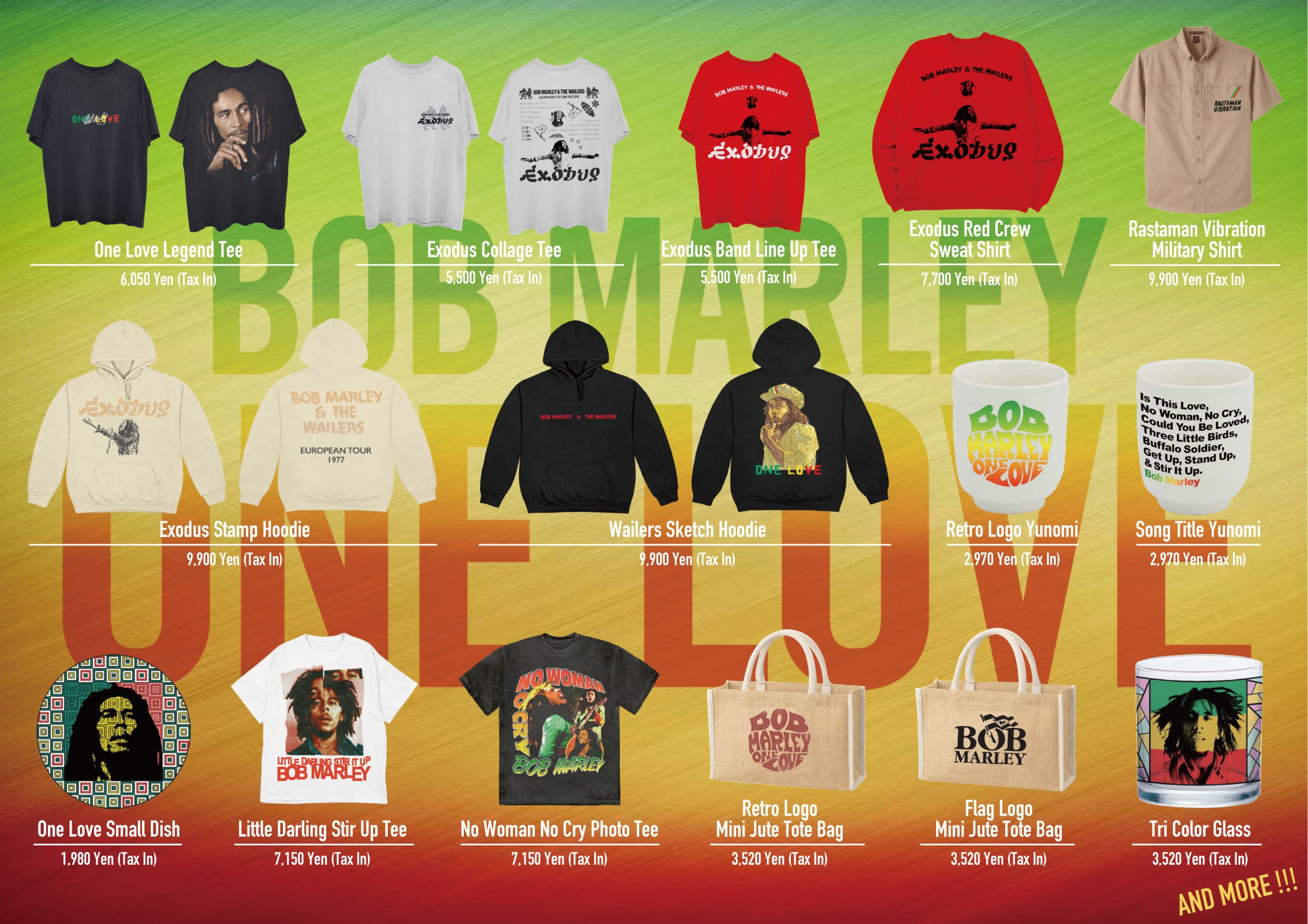 現在原宿竹下通りで開催中の『ボブ・マーリー:ONE LOVE ポップアップストア』のオフィシャルマーチをUNIVERSAL MUSIC STOREでも映画『ボブ・マーリー:ONE LOVE』の公開初日の本日から販売開始!2月にロンドンで行われたストアと同じデザインのアイテムや原宿ストアで人気の豆皿やそば猪口等、20種類以上のアイテムがラインナップ。是非この機会にご利用下さい。