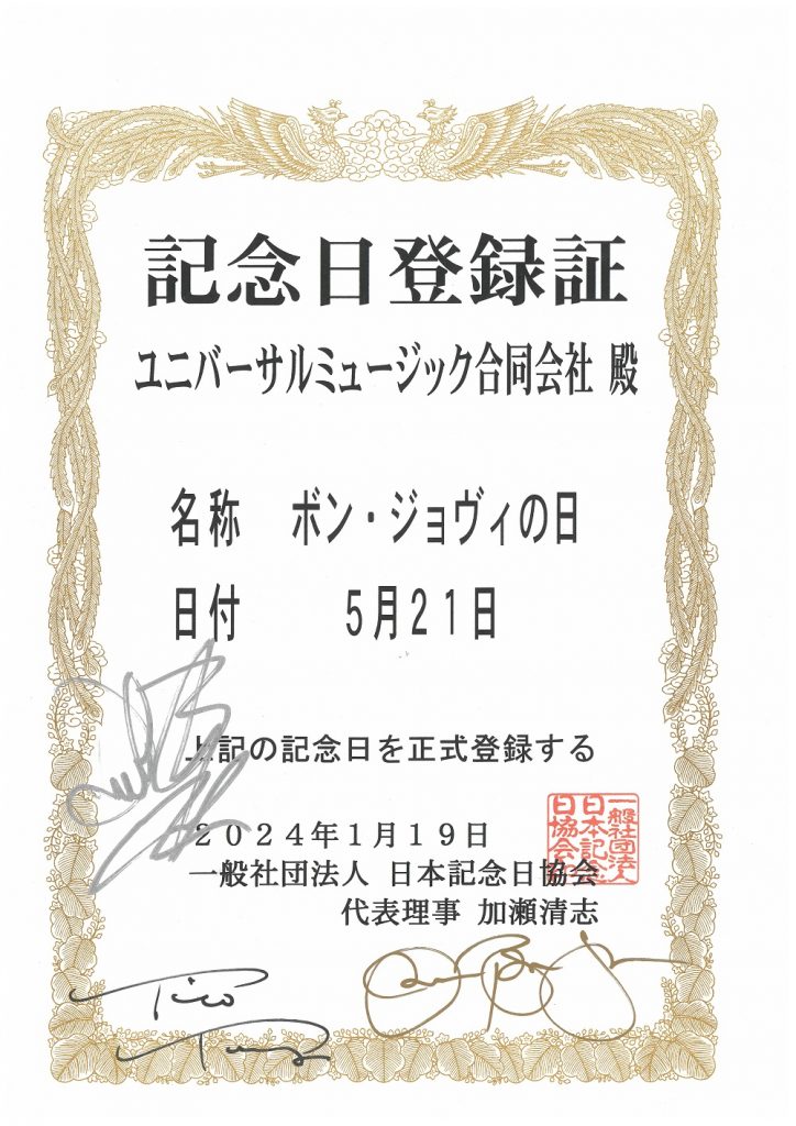 一般社団法人 日本記念日協会によって、5月21日が「ボン・ジョヴィの日」に制定されたことが、ボン・ジョヴィの公式アンバサダーである「なかやまきんに君」から発表された。