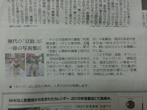 【豆助写真集】 朝日新聞で紹介されました! 2017.12.20 TOPICS おかげさまで「豆助っていいな。歴代ベストフォトブック」ですが 毎日追加のご注文をいただいています。 ありがとうございます! そんな中、朝日新聞にて写真集の紹介をしていただきました。 全国の書店にて展開中です! 引き続きどうぞよろしくお願いいたします。