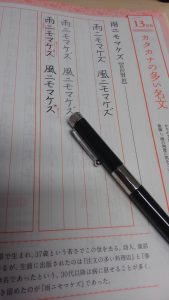 【ペン字練習帳】 風の谷の・・・・ 2018.08.24 TOPICS 今日は朝から凄い風と雨ですね。 みなさん、十分にお気をつけ下さい。 えぇ、サボっていたわけではないんです、けっして! 地道に練習は続けていたわけです。 この「30日で身につくペン字練習帳」で!! 雨ニモマケズ 風ニモマケズ・・・ でも、先生の字にはご覧の通りすっかり負けております・・・ さて、気を取り直して練習、練習。 チェストーーー! 気張れーーー!!