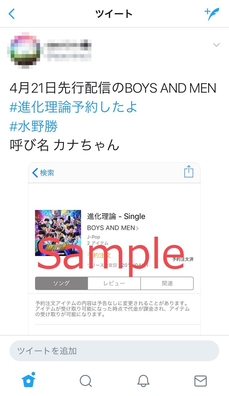 投稿例)4月21日先行配信のBOYS AND MEN #進化理論予約したよ #水野勝 呼び名(●●ちゃんor ●●君) 画像添付