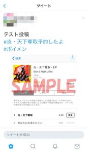 - 購入画面のスクリーンショットをハッシュタグ「#炎・天下奪取予約したよ」、「#ボイメン」の2つを付けてTwitterまたはInstagramに投稿。