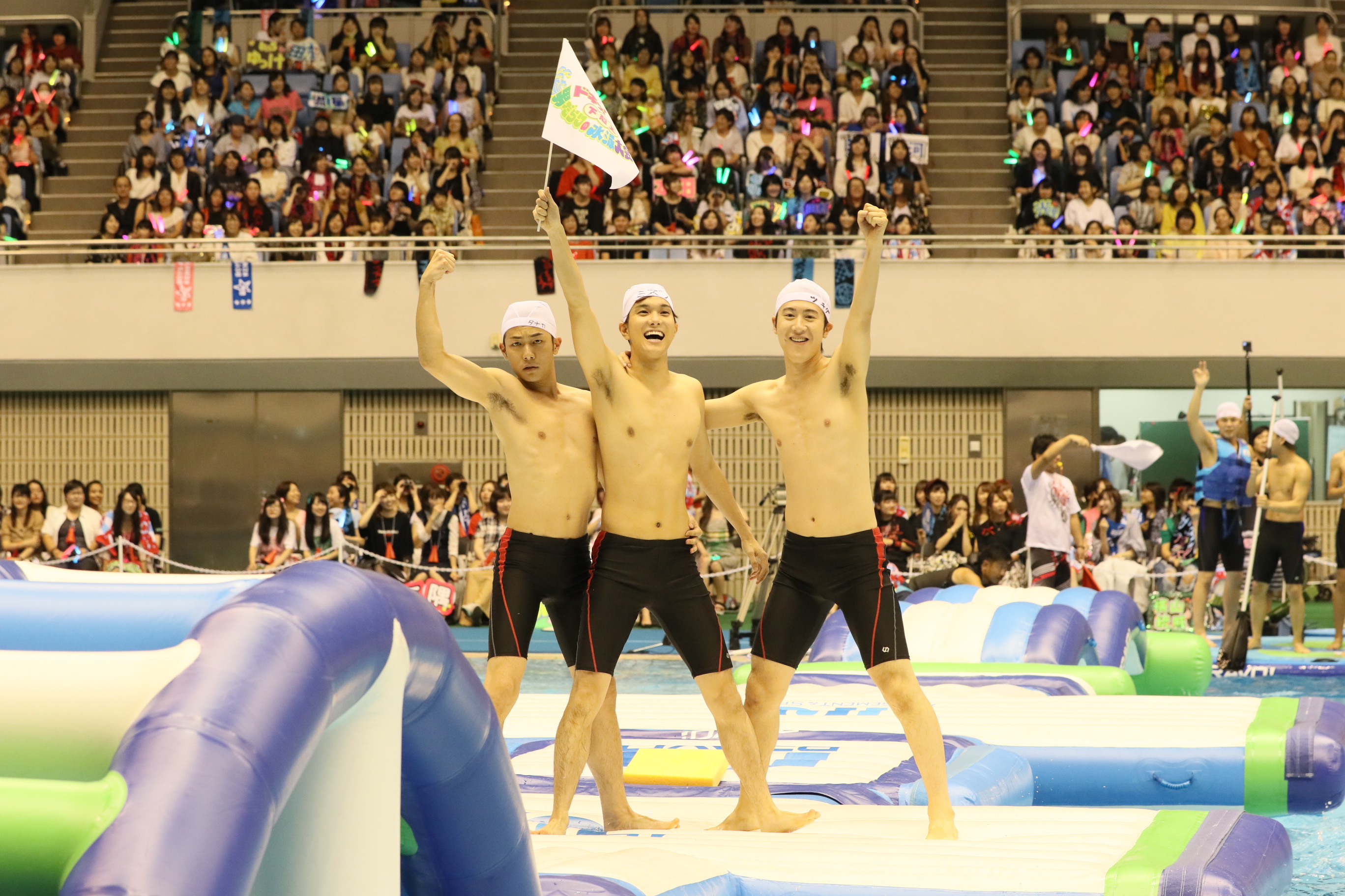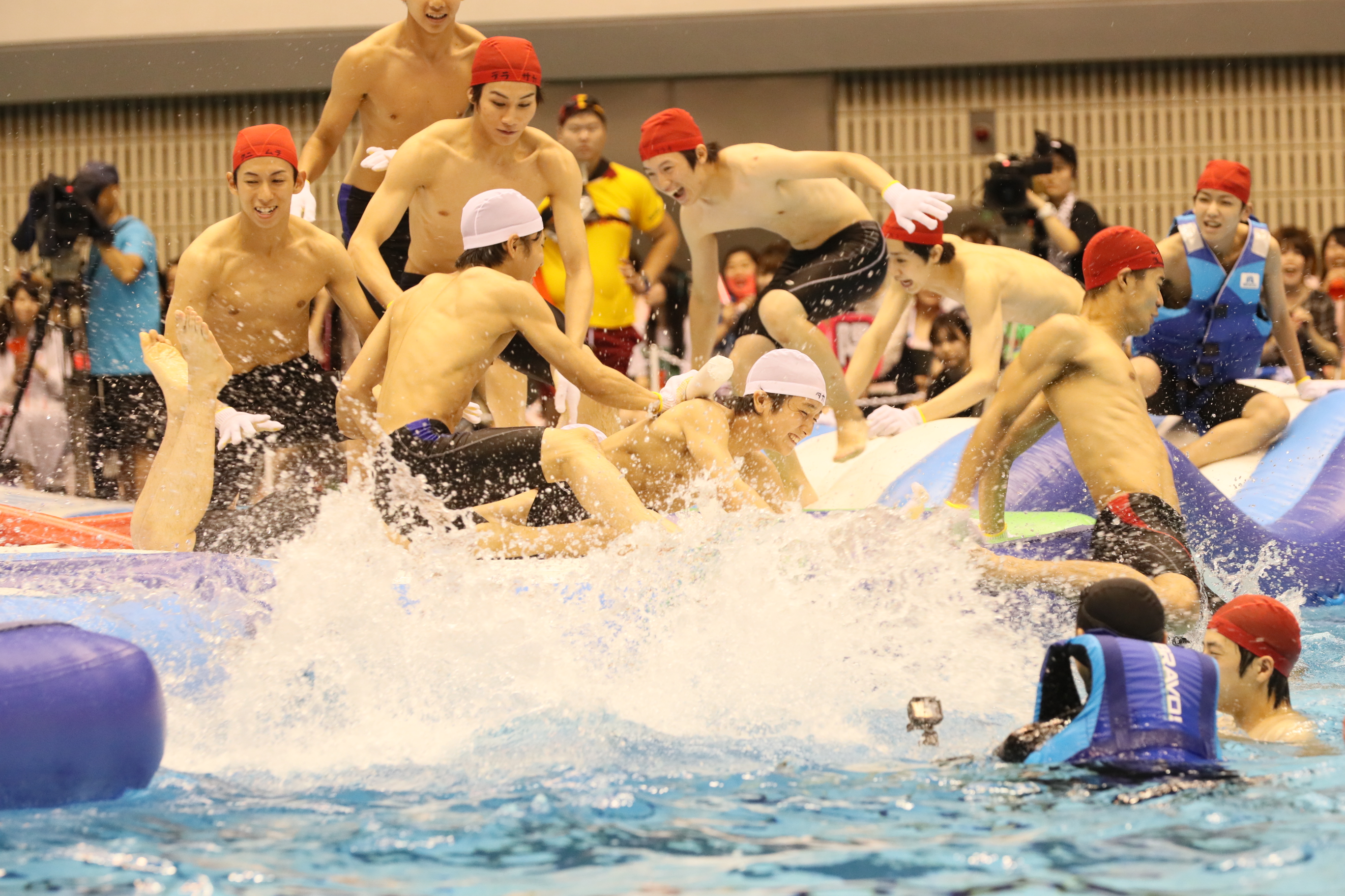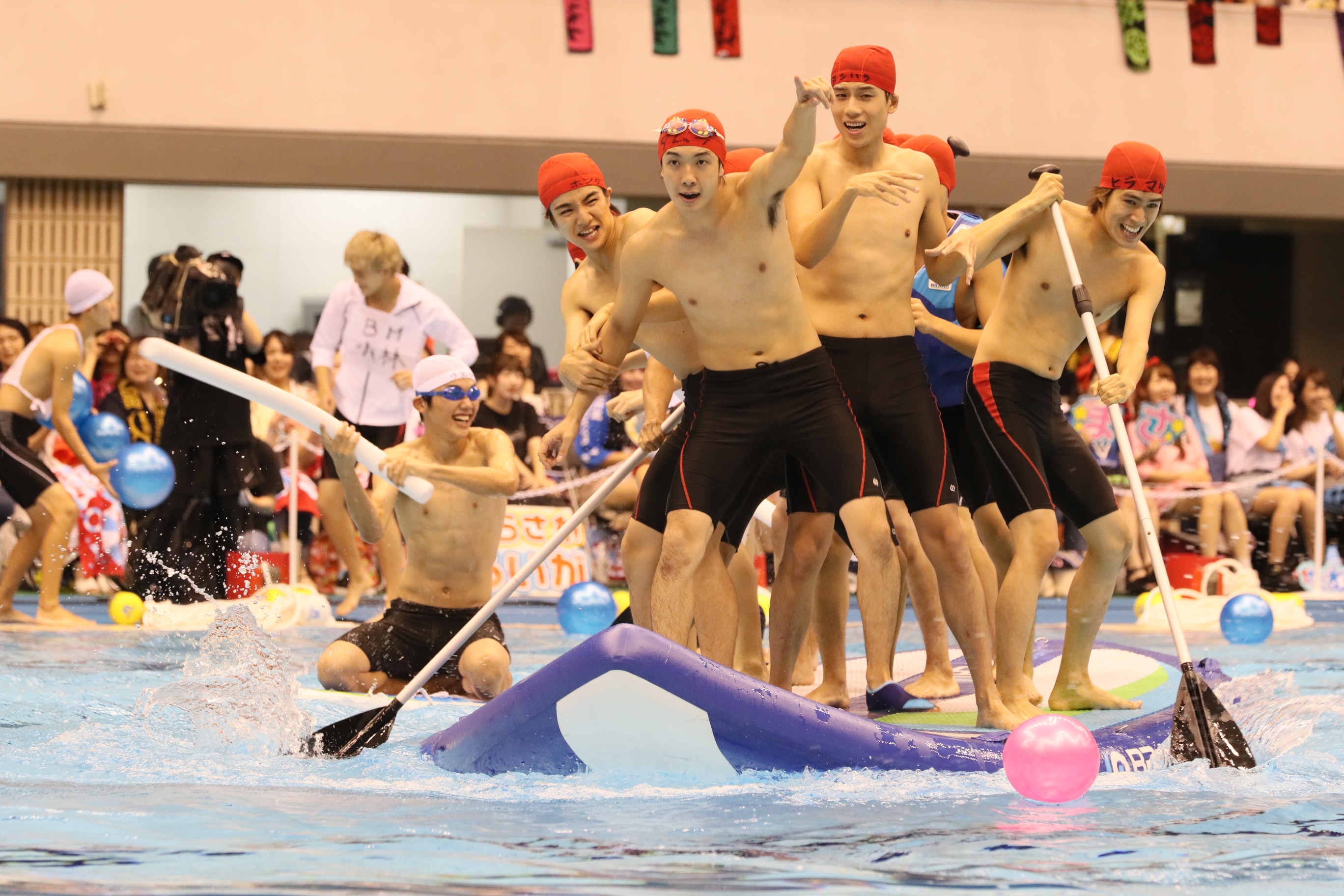 競技は全部で6種目。浮島を目指すボートレース、水上の浮島に置かれた小道具を使った障害物レース、ガチンコな25メートル競泳、水入れ合戦、浮島で落とし合いを繰り広げるバトルロワイヤルに、最後は目玉となるリレーなど、白熱したパフォーマンスを繰り広げた。