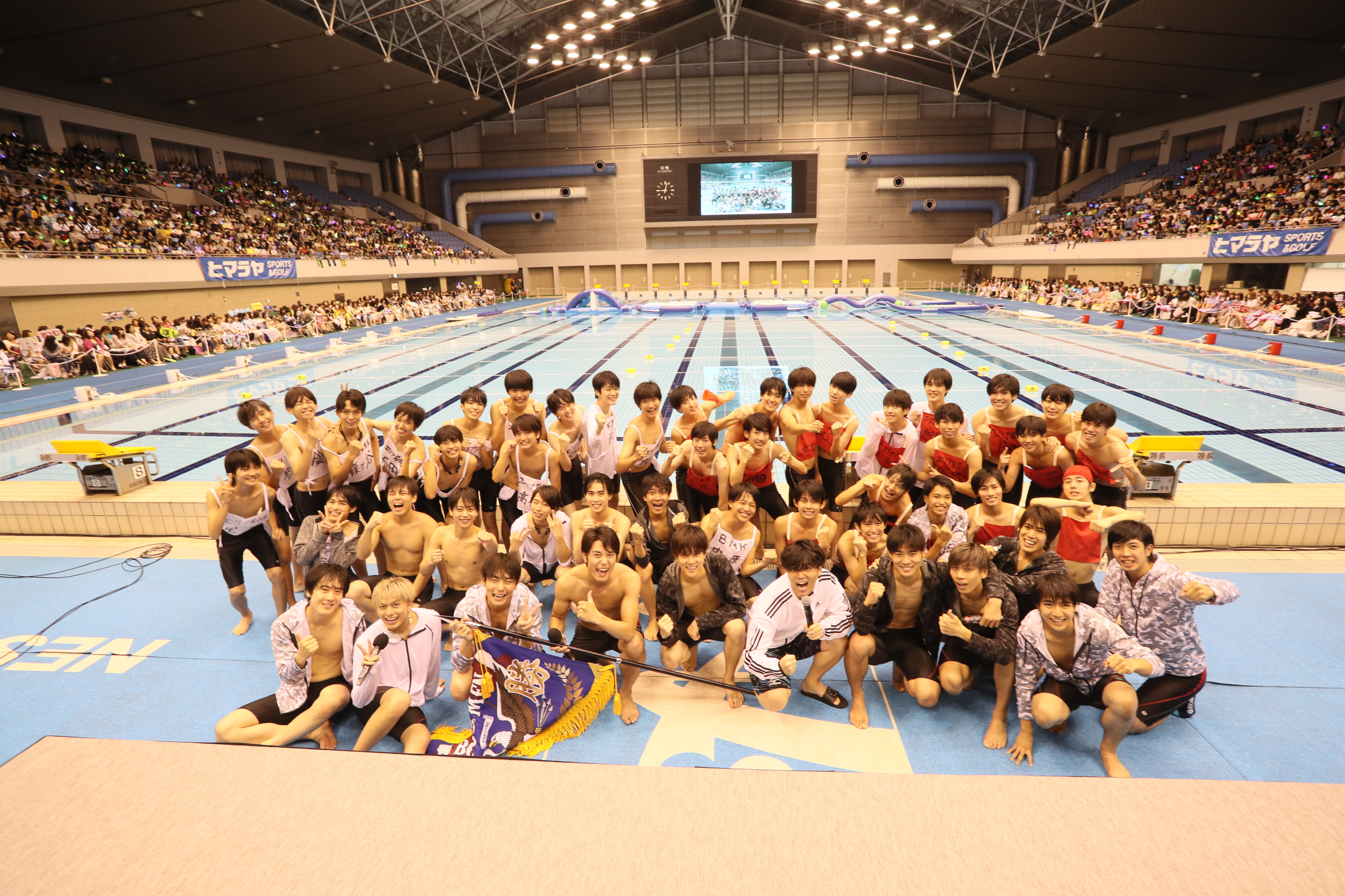 エンターテイメント系の水泳大会といえば、懐かしく思い出されるのが芸能人水泳大会。男女交えた人気タレントが一堂に介して、お色気や肉体美を披露してプールで戯れる姿は目の保養になったものだが、今回参戦したのは、すべて男。ボイメンを筆頭に、弟分である祭nine.やBOYS AND MEN研究生と、これからデビューを控える新人のエリア研究生たち“ボイメンファミリー”が、『日本ガイシアリーナ』の競泳プールに一堂に集結して、様々な競技にチャレンジした。