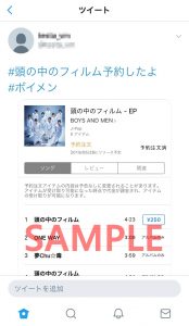 2. 購入画面のスクリーンショットをハッシュタグ「#頭の中のフィルム予約したよ」、「#ボイメン」の2つを付けてTwitterまたはInstagramに投稿。
