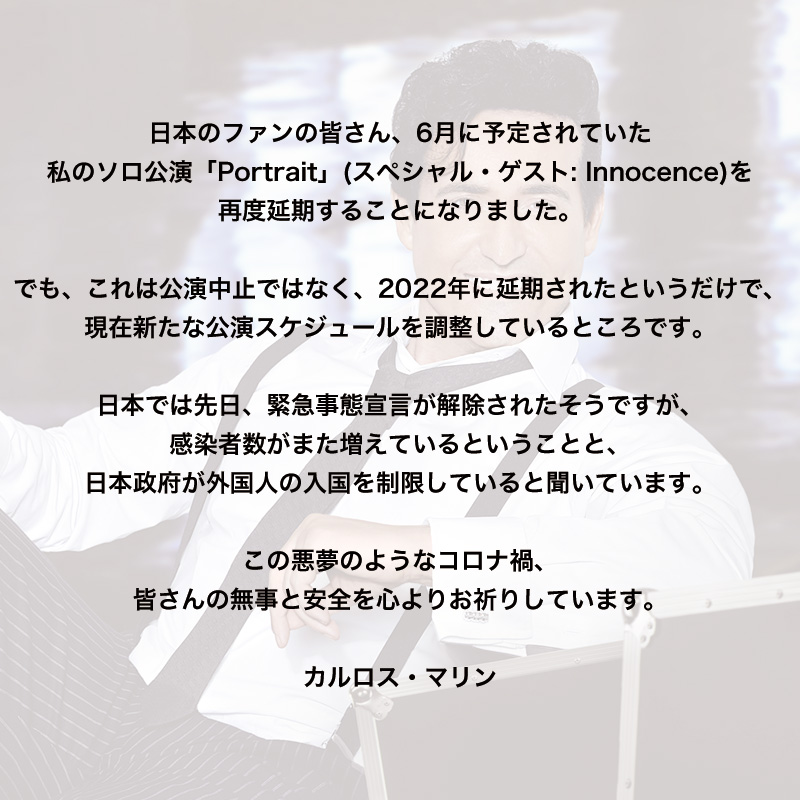 来日公演の見送りに関しての本人メッセージ 2021.03.25 TOPICS 来日公演開催見送りに関して、本人よりメッセージが届きました。 この投稿をInstagramで見る Carlos Marin(@carlosmarinildivo)がシェアした投稿