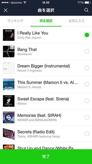 3. 楽曲はLINE MUSICの“再生履歴一覧”、“検索ウィンドウでの楽曲名検索”により選択が可能です。