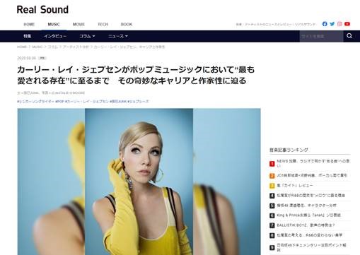 WEB「Real Sound」でコラム記事が公開! 2020.08.06 MEDIA - WEB ポップカルチャー・ウォッチャーの辰巳JUNKさんに執筆いただきました!■カーリー・レイ・ジェプセンがポップミュージックにおいて“最も愛される存在”に至るまで その奇妙なキャリアと作家性に迫るhttps://realsound.jp/2020/08/post-597484.html