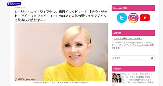 News ALL TOPICS MEDIA LIVE/EVENT 2020.06.05 MEDIA - MAGAZINE MC(ミューズクリップ)の最新号(6/10発行号)の表紙に! 2019.12.23 MEDIA - TV NHKでLIVE at NHKホール 放送決定! 2019.10.28 MEDIA - WEB WEBメディア「TVGroove」で来日インタビュー記事が公開! 2019.10.25 MEDIA - WEB WEBメディア「コスモポリタン」で来日時のインタビュー記事が公開! 2019.10.03 MEDIA - TV MTVで特集放送! 2019.09.30 MEDIA - MAGAZINE 雑誌「NYLON JAPAN」11月号にインタビュー記事が掲載されました! 2019.07.11 MEDIA - TV 7月12日(金)BS朝日「ベストヒットUSA」に出演! 2019.07.05 MEDIA - TV 7月7日(日)フジテレビ系「アオハルTV」に出演します! 2019.07.03 MEDIA - TV 7/15(月)tvk「洋楽天国+」にてカーリー・レイ・ジェプセンのインタビューがオンエア! 2019.06.28 MEDIA - TV 6月29日深夜 フジテレビ系「Tune」に登場! 1234567…1412345…14
