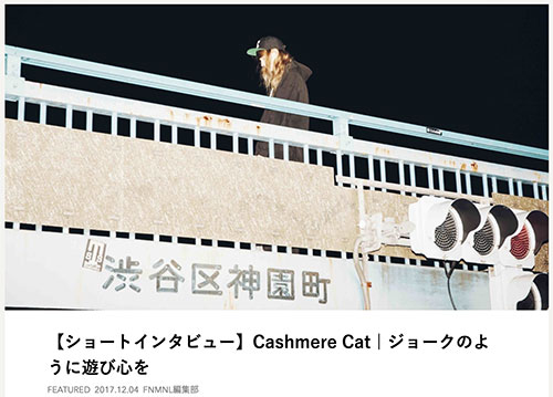 FNMNLにてインタビュー掲載中 2017.12.05 MEDIA - WEB 【ショートインタビュー】Cashmere Cat | ジョークのように遊び心を http://fnmnl.tv/2017/12/04/42926