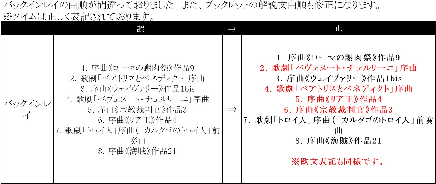 2024年3月27日(水)に発売しました『ベルリオーズ:序曲集/シャルル・デュトワ』(UCCS-50305)に関しまして、印刷物の曲順表記に誤りがございました。