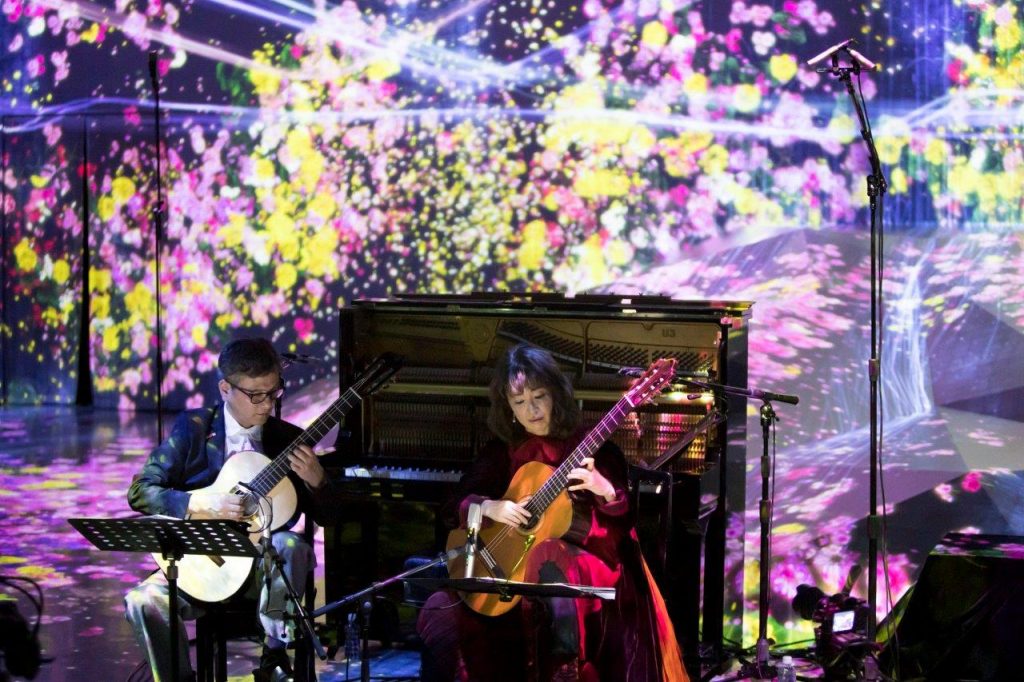 色とりどりの花々が咲き乱れる中、岩の上に流れ落ちる美しい滝。そんな幻想的な作品空間の中に深紅のドレスで登場したのはスペシャル・ゲストの村治佳織。滝の前を無数の鳥が羽ばくような演出とともに村治の奏でる「ムーン・リバー」でイベントは幕を開けた。3曲目からは伊藤ゴローが加わり、まずは「November」を演奏。日本が誇る2人のトップギタリストの洗練された美しい音色が会場を包み、ラストを飾った「Glashaus」では、会場はどこか情緒的で温かい空気で満ち溢れた。