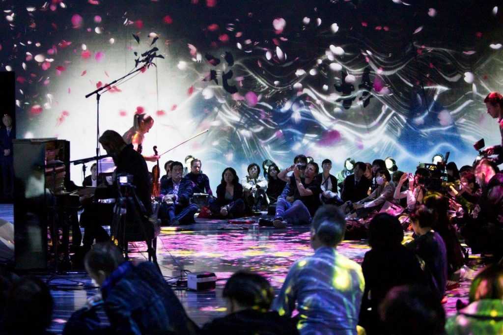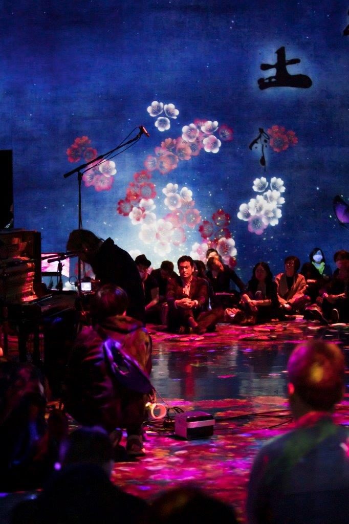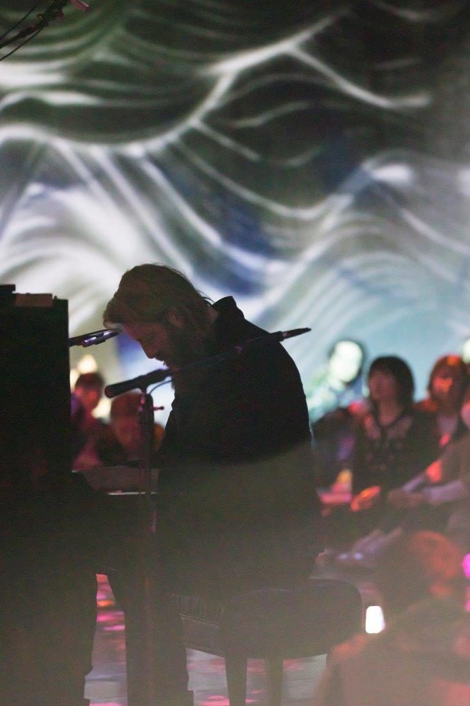 マリの演奏後、高揚感に満ちた会場に登場したのは、2回目の来日となったコンポーザー・ピアニストのユップ・ベヴィン。身長207cmの体格で“ジェントル・ジャイアント(フレンドリーな巨人)”とも称されるユップだが、その通り、蓋を全て開放させたアップライトピアノから紡ぎだされる音色は繊細で優しさに溢れていた。「Ab Ovo」「Etude」「Unus Mundus」と曲が進むにつれて、会場はユップの色に染まり、深い森の中にいるような癒しの空間へと導いた。途中、マリ・サムエルセンとのスペシャルなアンサンブルも披露しつつ、ラストは彼のセカンド・アルバム『プリヘンション』から「Hanging D」。それまで演奏された曲とは違い、激しいタッチで演奏されたこの曲では、壁一面に徐々に花が咲いていくアート展開とユップの奏でる一音一音が呼応し、会場の雰囲気はクライマックスに。壁一面に花が咲きほこると同時に演奏も終了。ドラマティックなイベントの終幕に、まるで夢から覚めたように観客は大きな拍手を送った。
