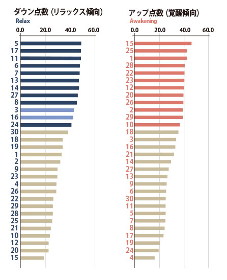 調査は20代から60代までの男女164名のモニターに、午前中と夕方の2回、クラシックの名曲30曲をランダムに聴いてもらい、その曲を聴いて気持ちが高揚するか、落ち着くか、などの「形容詞」14項目を10段階評価で採点してもらい、集計。