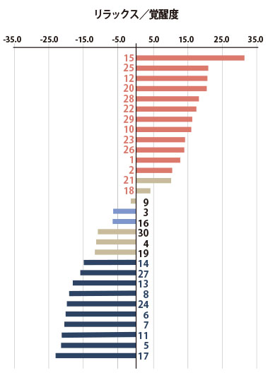 14項目の形容詞の組み合わせはなかなか興味深くて、「元気が出る」けど「ゆっくり」や「くつろげる」などさまざまな評価によって曲の持つ影響力を考えるのはなかなか楽しい時間でした。人々が思い描く曲の個性や性質が見事に表されるのです。今回のモニターでは、曲の一部の短いピースを試聴してもらいましたが、曲のどの部分を聴かせるのかによっても評価はかわってくるとおもいます。今回の調査は、依頼した調査会社にしても全くはじめての経験だったようでとても面白がっていましたね。アロマなどの香りも無限にあるようですので、こういった調査で、万人がリラックスする香りや、覚醒を促す香りがあるのか調査することも興味深いです。