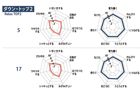 結果を集計したところ、「活動力があがるアップ系の曲」、「心が落ち着くダウン系の曲」がきれいに二分化しました。