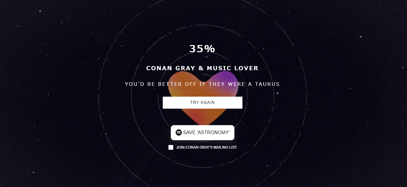 また新曲「Astronomy」のリリースを記念し、コナン・グレイは独自の相性診断メーターを確認できるウェブサイトを公開。自分の想いを寄せる相手と自分自身の名前を入れることで、2人の相性をパーセンテージに表してチェックできる。表示される数字に合わせ、相性の度合いに合わせた「Astronomy」の歌詞が一緒になって表示される仕組みだ。先日アップされた新曲「Astronomy」の和訳付き動画と照らし合わせながら見てみるのはいかがだろう。