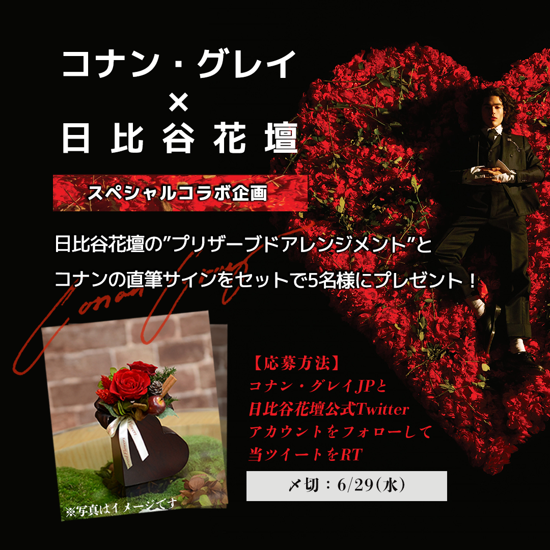 コナン・グレイ日本公式Twitter(@conangrayjp_ )と日比谷花壇公式Twitter( @hibiyakadan )をフォローし投稿をRT