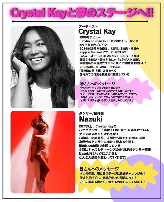子供達への大きな夢へのステップを応援していきたいという、Crystal Kay、Nazukiの想いを胸に次世代発掘に力を入れて、夢の企画が実現致しました。