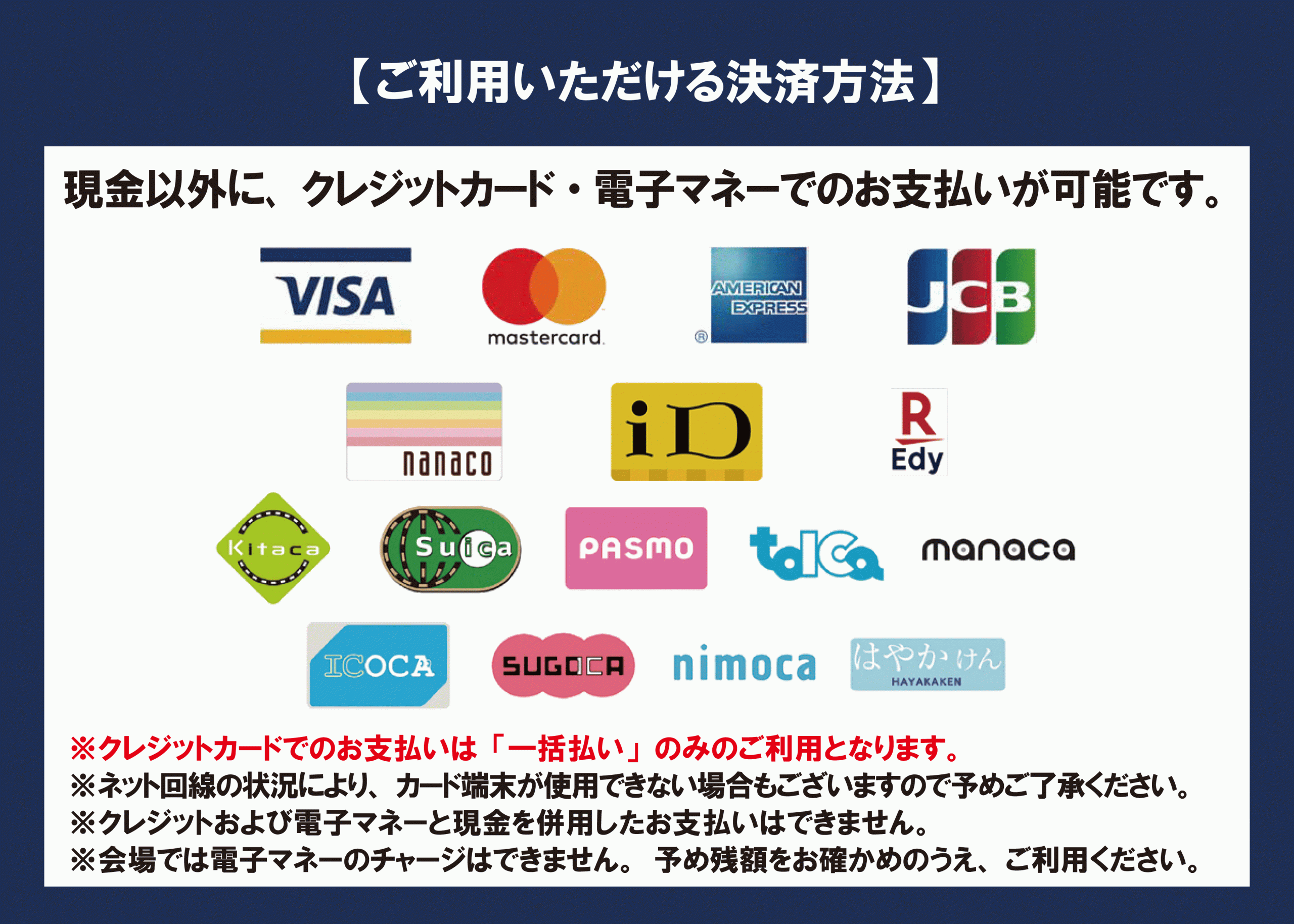 現金(日本円)・クレジット(一括)・電子マネーの販売となります。